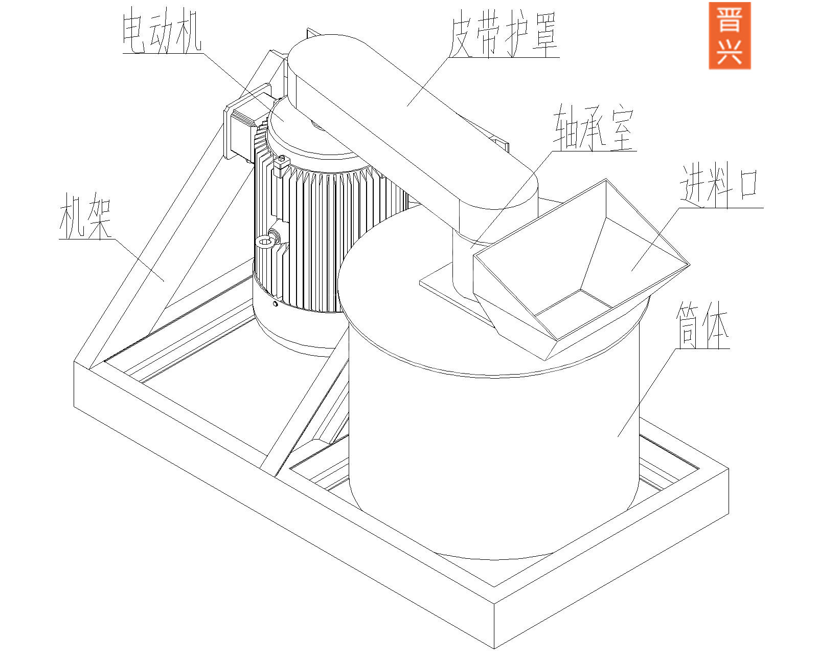 構(gòu)造組成:結(jié)構(gòu)由下機(jī)架、機(jī)殼、上下軸座、主軸、轉(zhuǎn)子盤、鏈條、錘頭、皮帶輪、電機(jī)架等部份組成。動力經(jīng)三角帶帶動主軸旋轉(zhuǎn),主軸有上下兩個軸承座,軸承座安裝在機(jī)殼的上端和下端。機(jī)殼總成安裝在下機(jī)架上,主軸上裝有轉(zhuǎn)子盤和鏈條,加料斗裝在機(jī)殼上部,為了裝卸錘頭方便,機(jī)殼上開有活門,便于拆裝維修。
